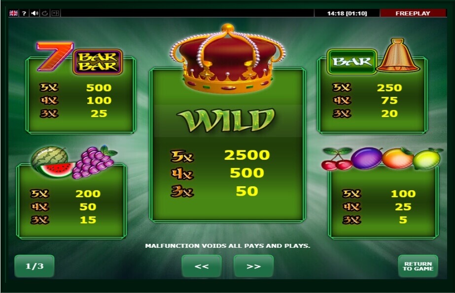 First, the user has to set the number of lines on which lucrative combinations will appear. To do this, the user needs to use the LINES function. Nearby you will find the BET button, which puts a bet on the round. When the player wins all prizes and a jackpot (1,250,000), he/she can press the EXIT button and leave the game.
