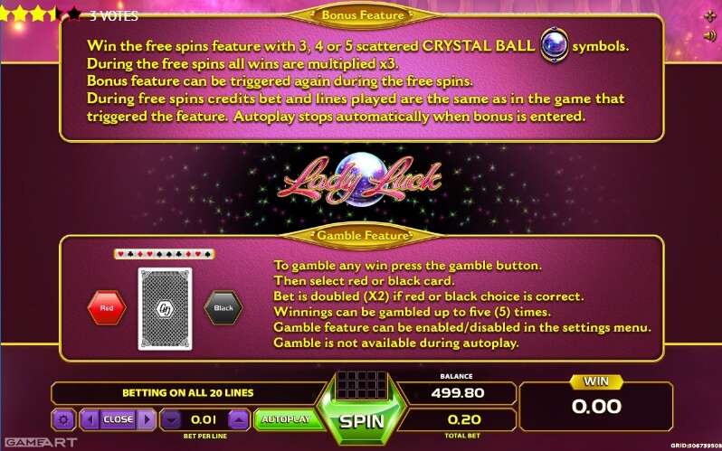 Lady Luck Online allows a player to enjoy the base of any slot machines: the world of luck. In the battery of the game, you`ll see a happy charm, the crystal ball and even the luck itself. You`ll definitely enjoy this wonderful game from GameArt. Lady Luck will watch you all the time!