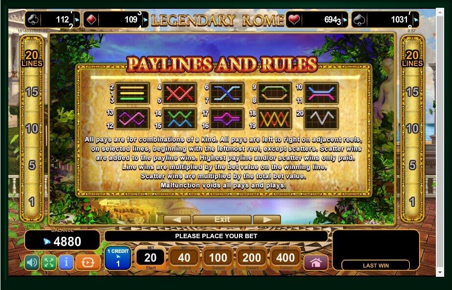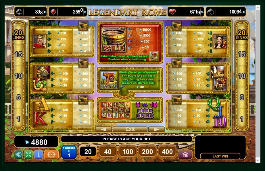 Do not miss your chance to be a rich person. Also, you will be able to see the icon of the Emperor and his wife in the Legendary Rome slot game. All icons and symbols mean something from the culture of that time. You can choose different games with 1, 5, 10, 15 or 20 pay lines. It is up to you what number of pay lines to choose. However, the more pay lines you have, the more chances for the victory you will have. You will be able to make the bets from 20 credits up to 400 credits. It is not as difficult as you think.