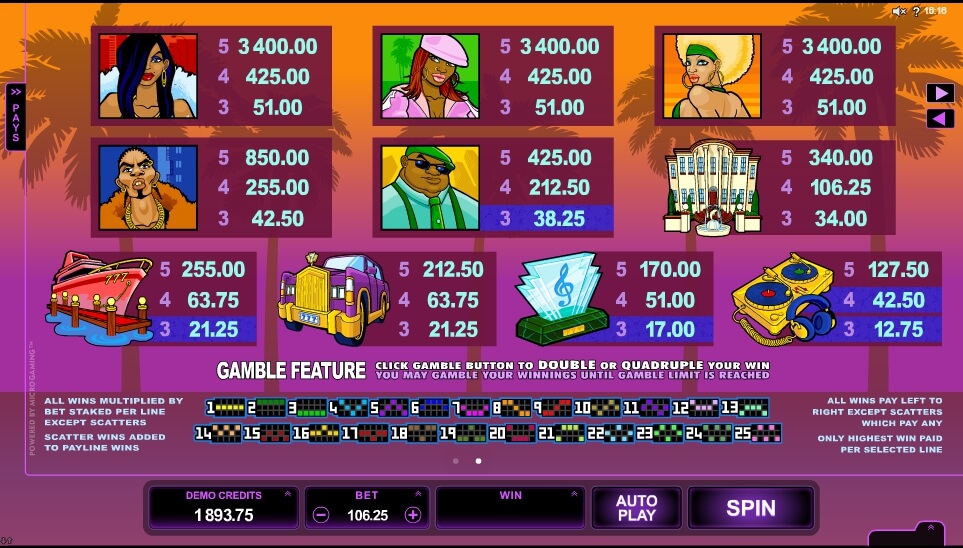 Their clothes combine sports and hyper-sexy clothes, such as open tops, skirts, microscopic shorts, tight pants, and tight dresses with a deep neckline. Men wear dimensionless wide pants that are held in place only by straps, tight or broad T-shirts with inscriptions and drawings, sports loose suits, sneakers, baseball caps, leather jackets, thick chains and bulky pendants.Microgaming ventured to combine R & B style and the Las Vegas gambling world in the Loaded video slot.