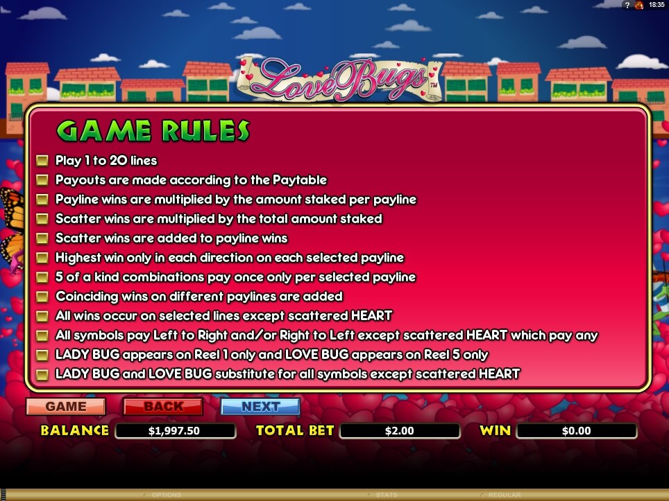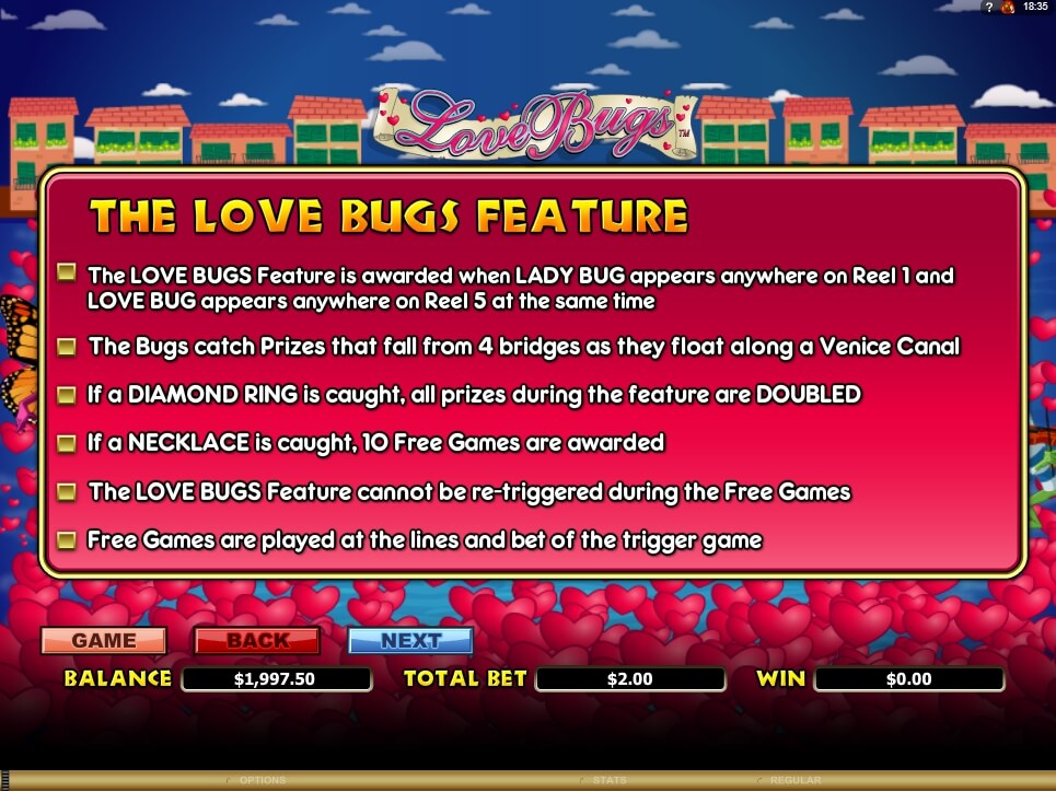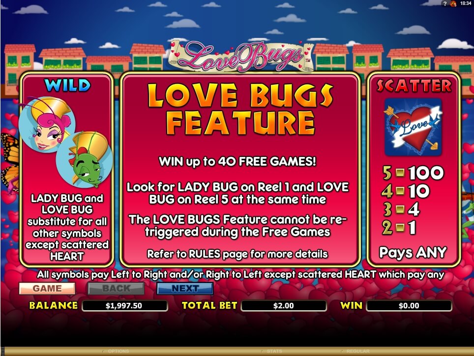 The 5 snow-white reels of the Love Bugs Slot are dividing by the lovely-rosy lines which are placed vertically. The playing grid which has size 5*3 is framed with a border that has the same shade of rosy color. By your right hand is skillfully playing on a terracotta-brown violin is a fan of Esmeraldine, Matthieu Verte worn in a blue and white striped tracksuit and traditional French beret. Large brown eyes are fixed on the object of his dreams and mustache is strongly twisted from tension and concentration.