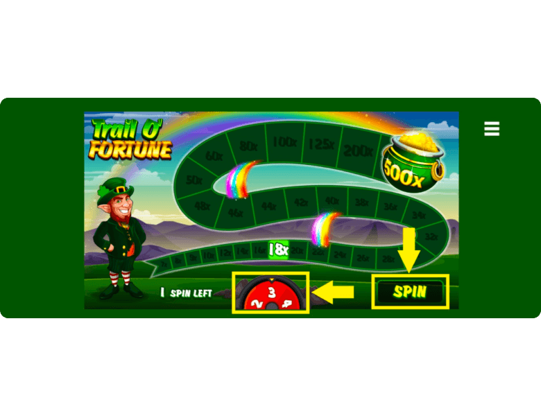 The Trail O’ Fortune mini-game follows a path-style arcade format with step-by-step progression and is activated when 3-5 bonus scatters in the form of pots of gold land on the reels. The number of these symbols determines 4-6 wheel spins. Each spin grants several steps forward along the path, where each square displays the current bonus multiplier.