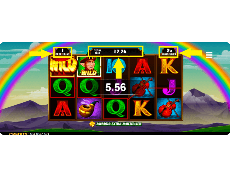 To trigger the free spins, you need one scatter on the fifth reel—a gold coin with a four-leaf clover. You are awarded 5 free spins and a progressive multiplier that starts at x2. The triggering scatter immediately pays x1 of your bet, and the leprechaun becomes an additional Wild. Card symbols A–10 can appear with either a green or gold clover. A green clover awards an extra free spin, while a gold clover increases the multiplier by x1, up to a maximum of x5.