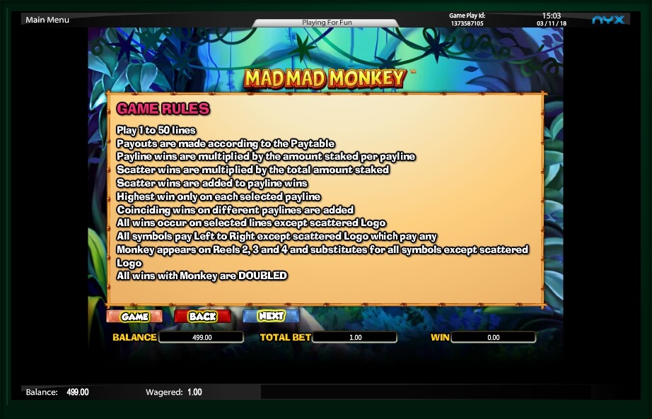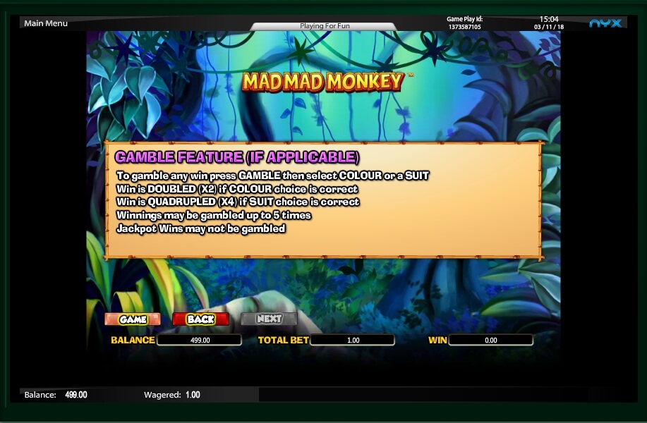 Another bonus game in the Mad Mad Monkey video slot is called Gamble and you can activate it at will after any winning combination by clicking the appropriate button. This game is standard for most slots: you need to guess the color and suit of the card. In the first case, you will double your winnings, in the second – increase it by 4 times.