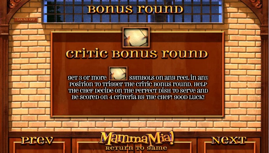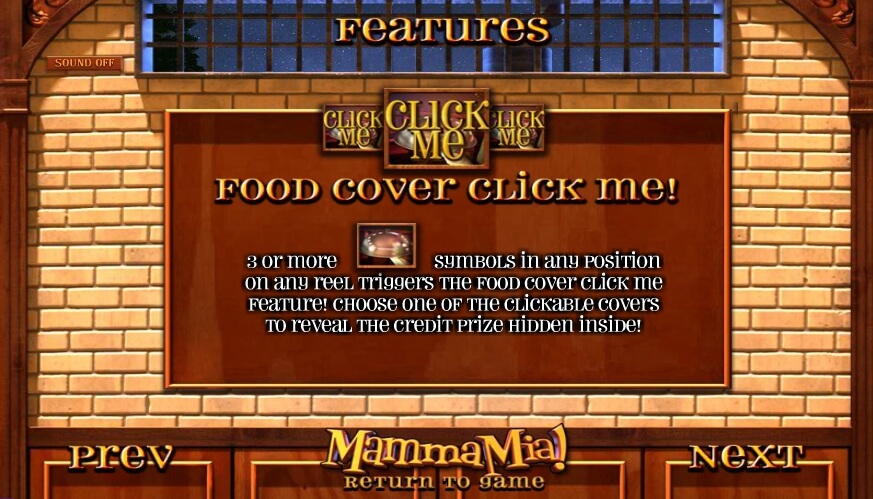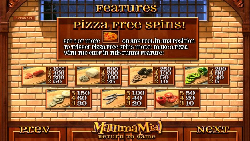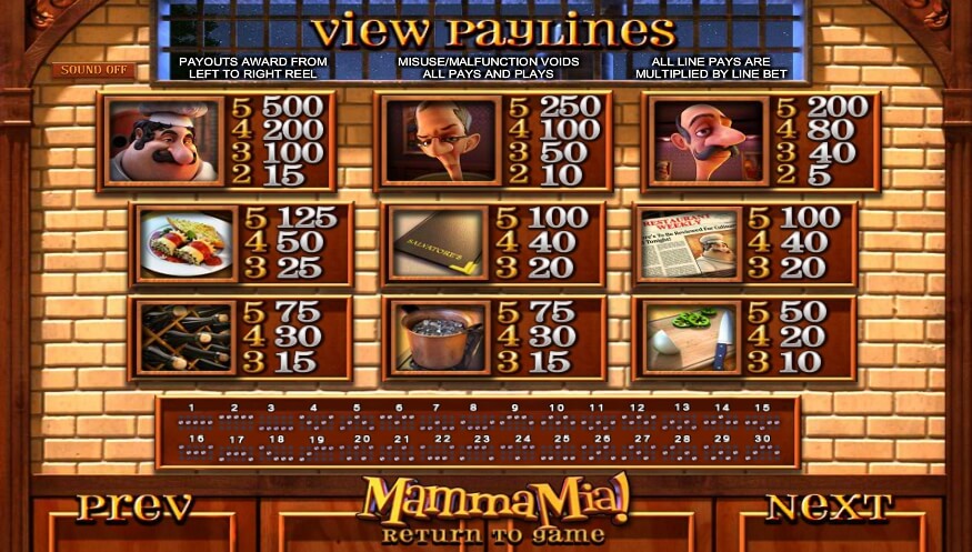 On the white part of it, there is a large black soft rectangle panel with a bright-red thin frame around it and a bloody-red Mamma Mia title. Oppositely, in the grid’s ”floor”, there is a huge collection mostly of green colored buttons: ”Lines” (grassy-green ”left back” and ”right back” arrows set Mamma Mia Slot’s ”lines” where the ”25” is the biggest size); ”Coins” (it is placed on the same as ”Lines” panel and that is why has the same regulators); a bright-rosy ”AUTOBET” (pushing the reels by itself); a fresh-green circular ”Spin” with golden rounded frame and two couples of ”vertical arrows” (^); a ripe-red ”MAXBET” (for making a max wager in one click); ”Coin Value” (has the same by color and look regulators as ”Lines”- or ”Coins”-panel); a rich light-orange ”Paytable” (extra window shows present icons in Mamma Mia Slot ); a clear as a spring sky light-blue ”Show Winlines”; like a ripe cherry ”Reset Bets” and three sub-buttons for regulating the music/sounds and general settings.