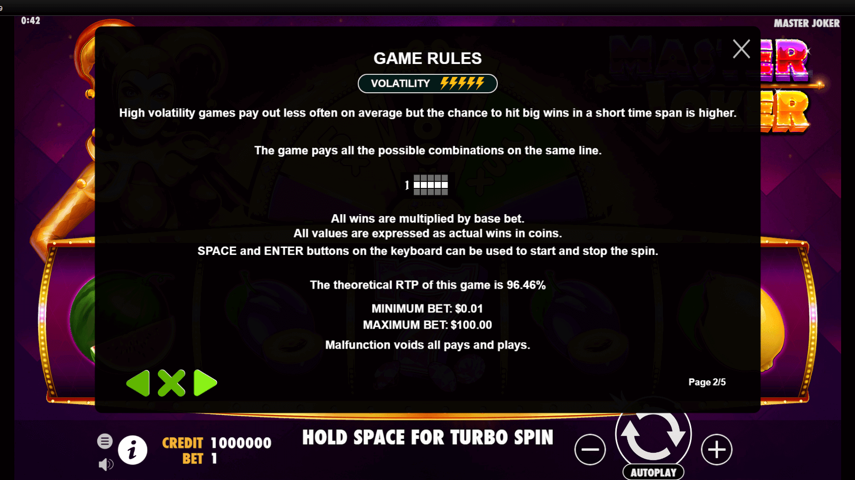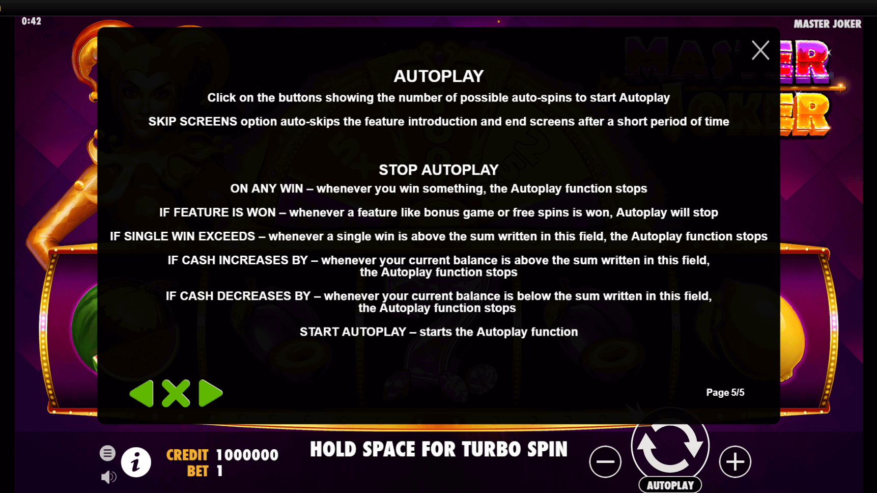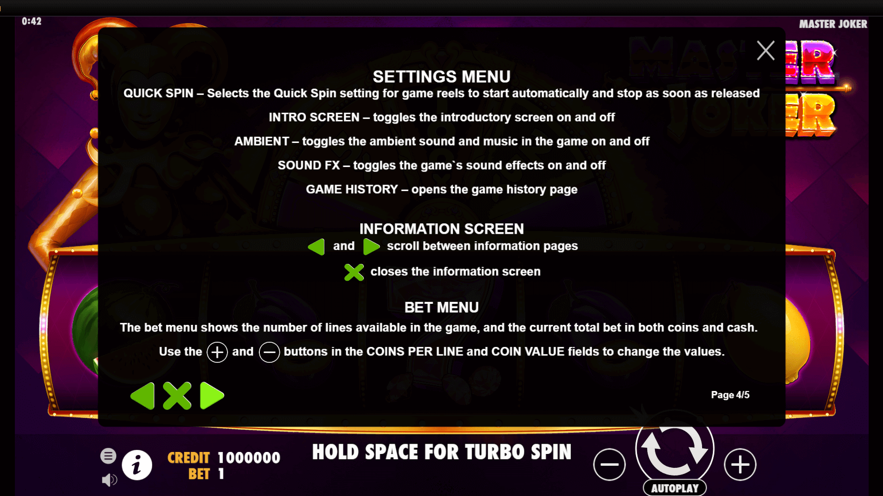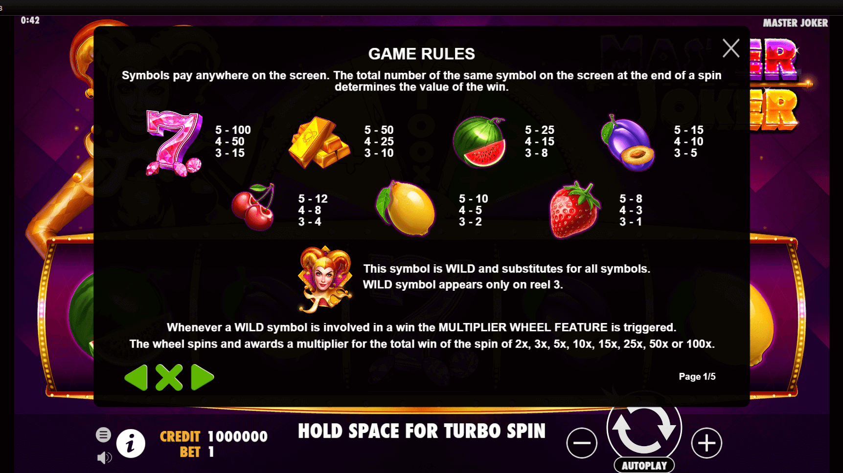 The visual style sticks to glossy fruits and shimmering symbols. The Joker character stands to the side of the reels, occasionally animating when the Multiplier Wheel activates. The soundtrack and sound design perfectly match the theme. The only thing that felt distracting to me was the reel spin sound — it added a bit of mess. Still, compared to Joker’s Jewels, where the sound design is completely chaotic, Master Joker felt much more polished.