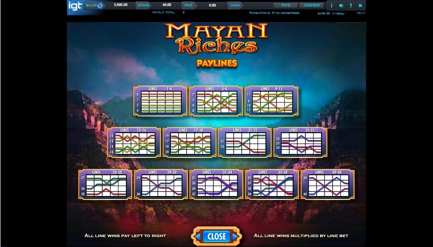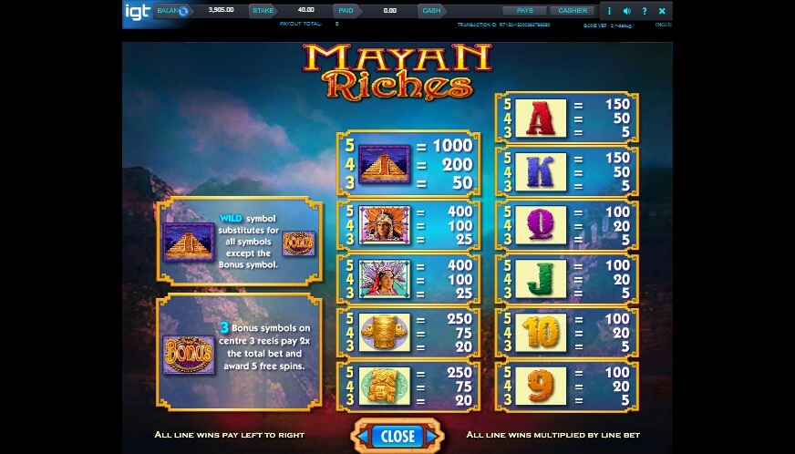 The Mayan Riches slot machine has 5 reels and 40 active lines. The wager in the game is fixed: all coins have a denomination of 1 dollar, but you can adjust the amount, using the Line Bet button. The jackpot in the game is 800 coins.