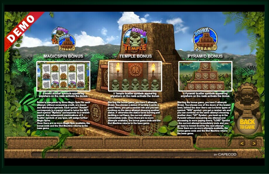 Many scatter icons help players participate in small games, and there is wild and a joker icon to catch on the reels, they replace all basic symbols and get you rewards. Try it out and you will never regret. Mayan Temple Revenge is worth every second spent on playing it!