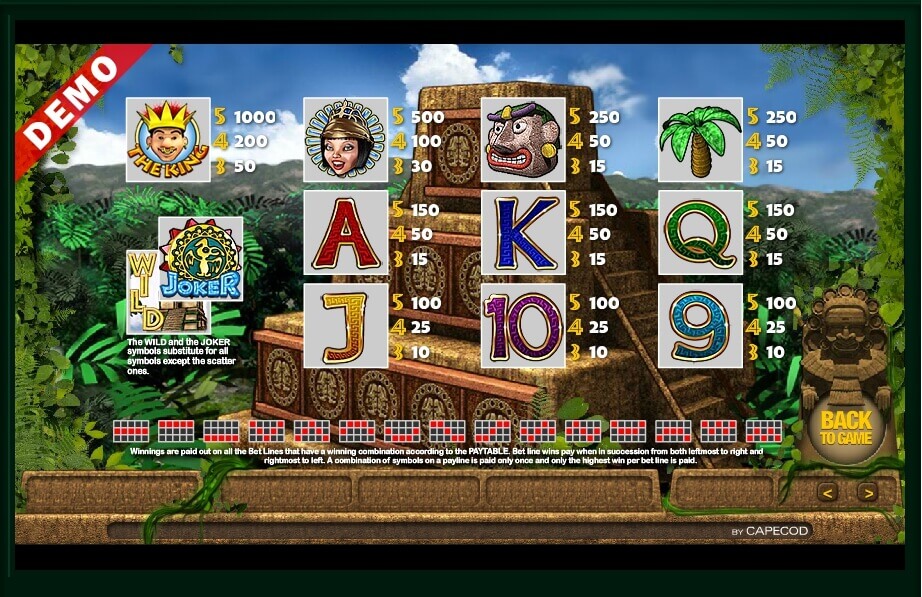 Mayan Temple Revenge takes you to feel the atmosphere of a lost civilization and the intelligent people that lives in this secret world that all the scientists until now try to reveal. Behind the reels you will see the tropical forest and the temples of Maya, their mysterious constructions and huge heavy stones with hidden enigmas. Mayan Temple Revenge is very realistic, and spinning of the reels just lures you into the unbelievable atmosphere of the Mayan temples. Get ready for a real fun!
