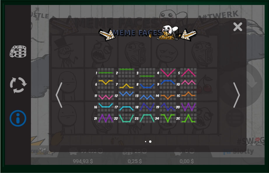 Many players would ask what this satirical slot has to offer apart from the reason to laugh and giggle. In fact, the Meme Faces casino game has almost the same range of features as other adventures produced by this software developer. It is a 5(3)-reel slot where 25 ways to win big prizes will be available to users.