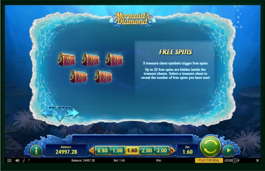 In addition, if on reels 5 chests with treasures drop out, then the round in which, having chosen one of the pictures, the player will define a quantity of bonus spin will begin. They can be up to 25. During such rotations it is necessary to watch diamonds vigilantly. When 5 such signs gather, the option Trident Wilds which will influence the effectiveness of process throughout several rounds is activated. The feature of a tour of free spins in Mermaid’s Diamond slot is unlimited and any repetition.