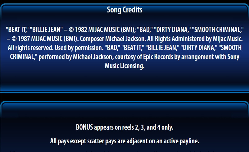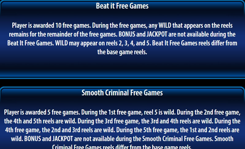 If you win Free Games, you should be aware that there are 2 different features of them: Beat it Free Games and Smooth Criminal Free Games. In the Beat it Free Games, you will be awarded with 10 spins. During this feature, any Wild that appears on the reels remains there till the end. Bonuses and Jackpot are not available during this feature.