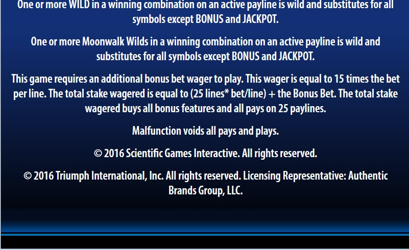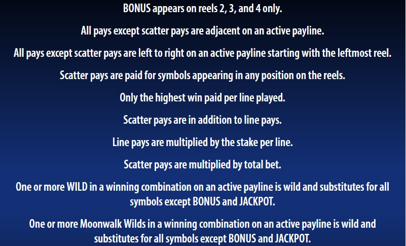 During any spin in the base game, there is a chance that between 2 and 5 random Moonwalk Wilds will appear on any reel except for the reel No. 1. Moonwalk Wilds substitute for all symbols except the Bonus and Jackpot symbol. If one of them lands on a space where a Wild appears, it will be counted as both Moonwalk Wild and that symbol.
