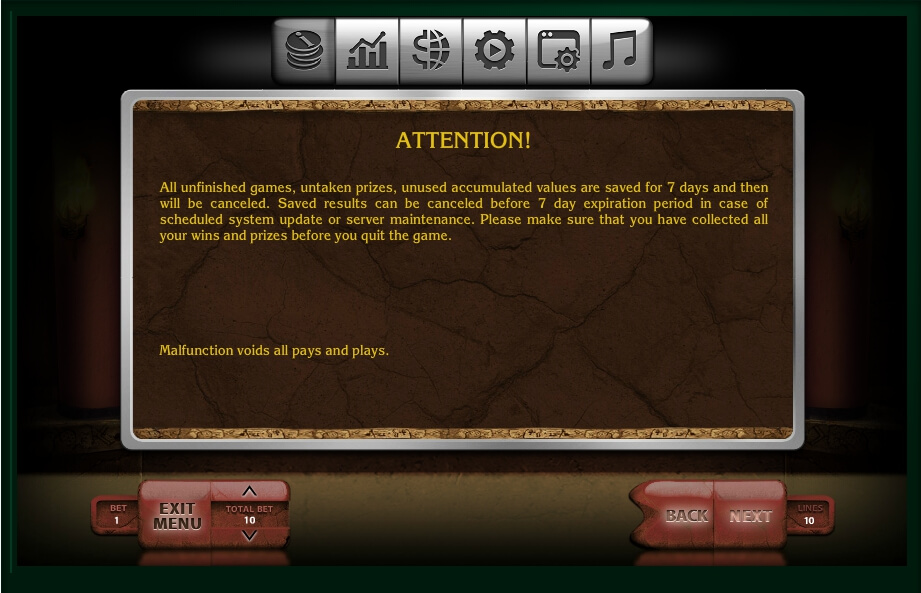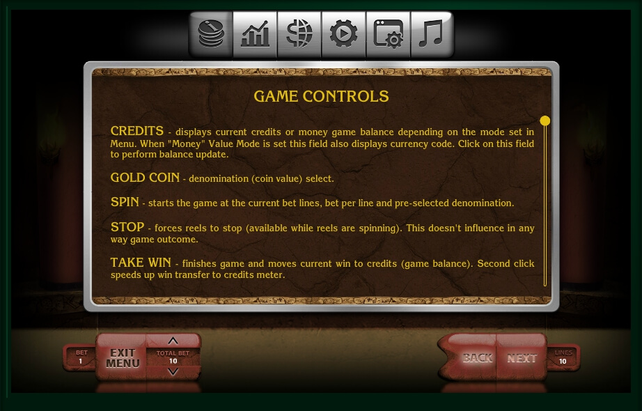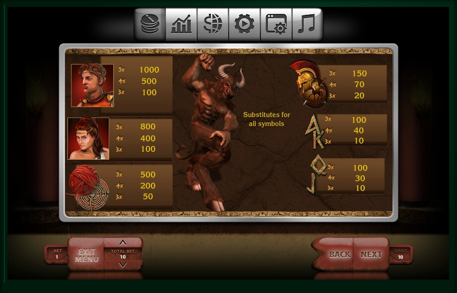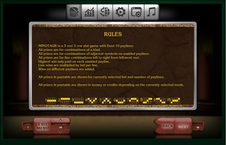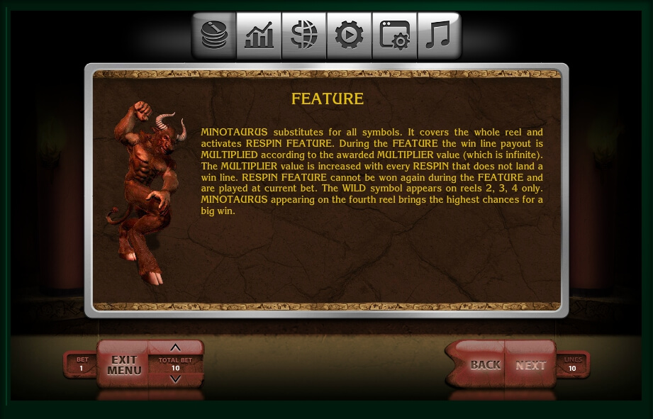 The Minotaurus is a 5-reel model with 10 lines and three rows of pictures on the screen. The layout of active lines is available in the rules. You can play the slot machine with one to ten coins per payline. Their denomination can be from 1 cent to 1 US dollar. The set of available functions includes special symbols, bonus spins, additional multipliers, odds and other options considered below. The usual way of paid combinations formation on active lines of several pictures is like this.