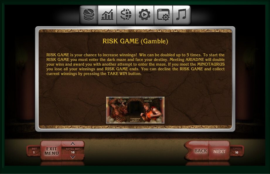 At the end of the spinning round, the user can immediately transfer money to the account or try to increase them in the Minotaurus risk game for the doubling. Here you can guess the color or suit of a closed card. The correct color doubles the payout, and the correctly named suit increases it fourfold. Rules allow in one round to play several times in a row. It is impossible to be mistaken!
