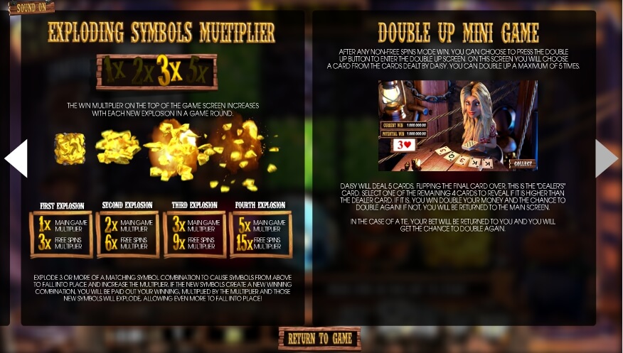 No downloads or registration are required. You can play the More Gold Diggin online for free or for real money, but the principles and bonuses still remain the same in both versions. Just select a bet and turn the drum. If you win, the next result doubles, with a second win, tripled, and so on. You can also double your winnings by playing with Daisy. There is the “bet max” possibility that greatly accelerates the process of the game. You can also use the “autoplay” where you choose bet per line and coin value, and also a number of automatic spins. As soon as you chose an automatic option, you can enjoy the animation. The characters in the game are represented by precious stones that can be found in the mine, as well as wild dynamite and TNT barrels, which give additional points!