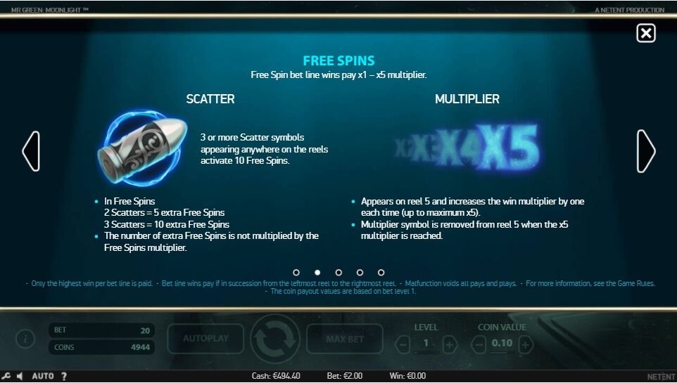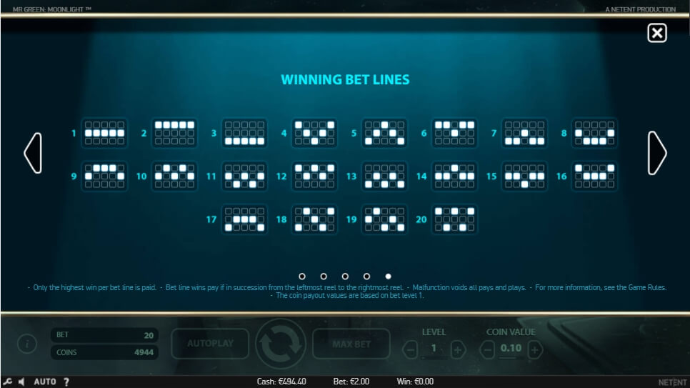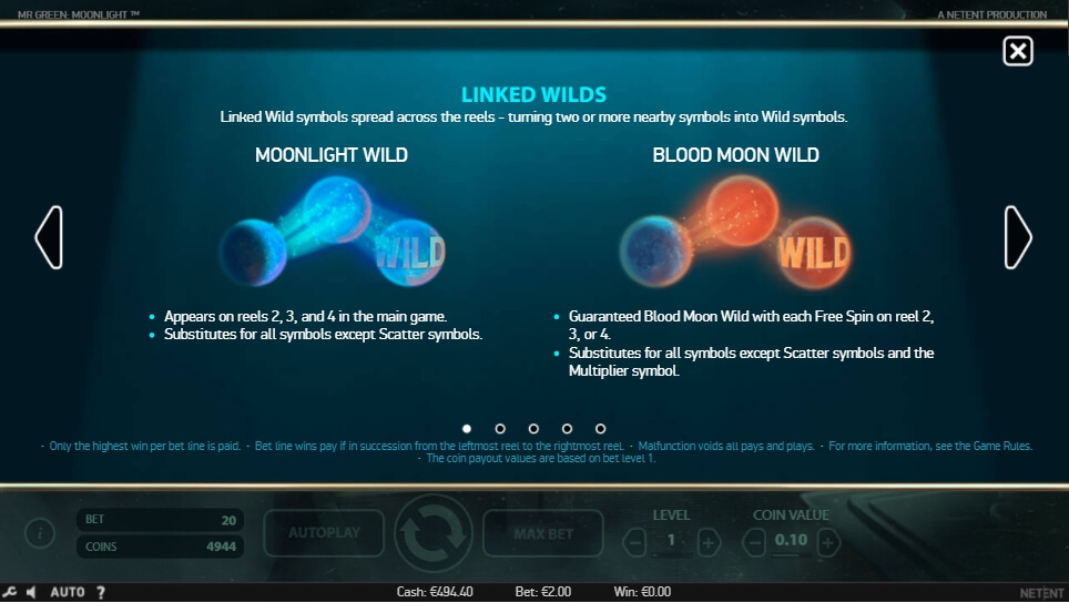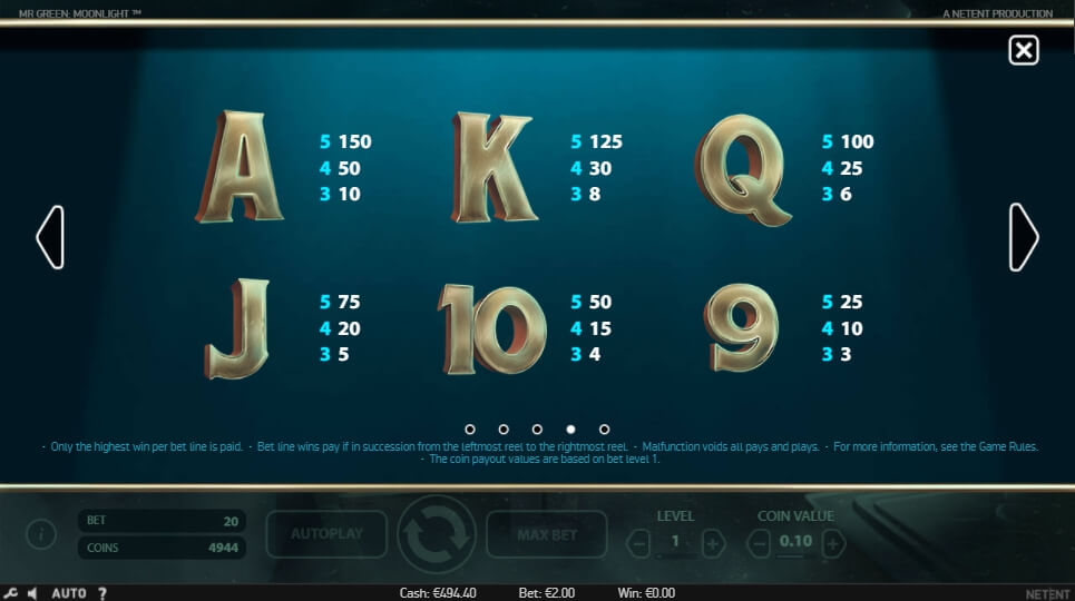 The Mr Green Moonlight online has one simple rule – collect matching slots on the same paying line and you will get bonuses. Use them to increase the winning score a couple of times. However, it doesn’t mean the player should only collect similar items.