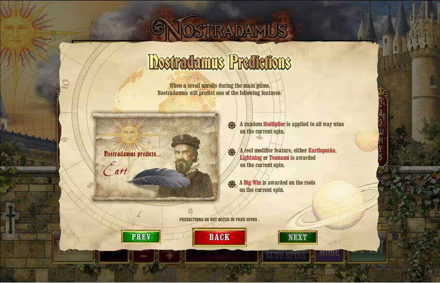 The amount of payment will depend on the rate that was set. Three to five scatters give 5-15 free rounds. Special images and options also take part during free spins. The “Nostradamus Predictions” mini-game can be activated during any spin.