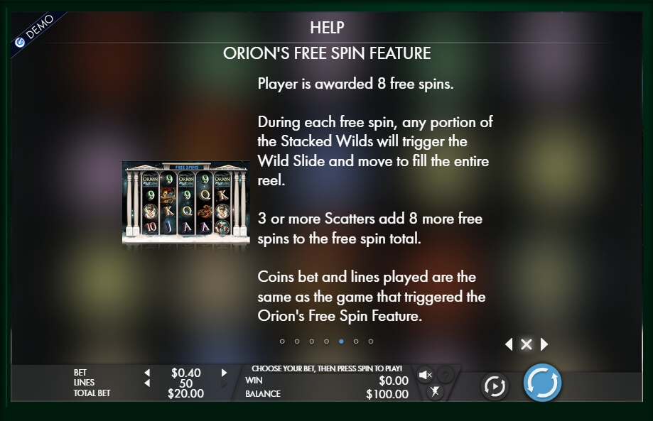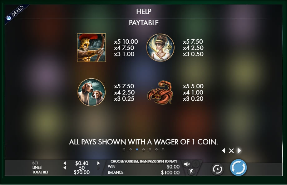 In Greek mythology, Orion was the son of Poseidon and became a famous hunter. This video slot is different from other games by its design. Once the user has downloaded the game, large columns appear in front of him, among which is the playing field. The entire gaming process takes place against the background of the starry sky.If talking about the technical side, the gaming machine has 5 reels and 50 paylines. The control panel is equipped with special indicators to demonstrate the size of the bet, the credit balance and the amount of winnings. First, set the bet amount. The information on the bet amount and other tips appear on the screen section under the reels.Then set the number of active lines. Now you can press spin or autoplay. The last one starts the game in automatic mode. This function is very useful, since the user is not distracted from the gaming process.