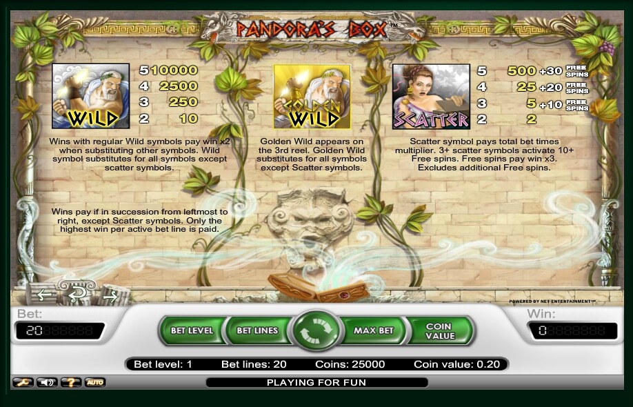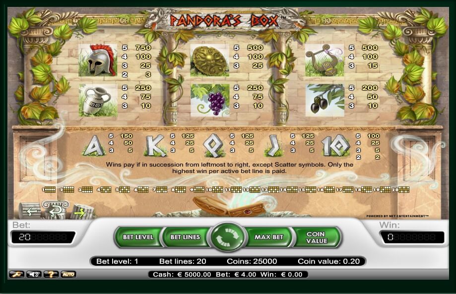 The classic conceptual video slot Pandora’s Box features a pleasant gameplay and generous special characters. Among the many existing gambling games, the devices devoted to antiquity occupy far from the last place. The slot is suitable not only to fans of classics and fans of Greek mythology, but to everyone who prefers high-quality emulators from NetEnt.