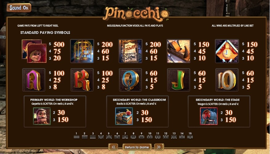As you can guess by the name, the Pinocchio casino is the game, based on the famous book story. Developers from Betsoft Studio took their inspiration from the good-old tale. Just look at the gaming field and you will find a lot from the original product. Creators of the project dedicated all their power to creation of a really good game with different ways to win. But what is more important, the gamer can find characters from the both sides of the reel. They are perfectly represented with the use of three dimensional graphics.