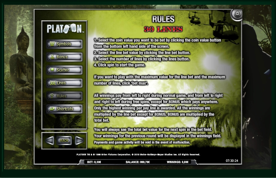 Playing on the space machine Platoon is permitted on any number of dynamic lines up to thirty. Up to ten coins with an estimation of 0.01, 0.02, 0.05 or 0.10 pennies can be set on one line. On a turn it is allowed to put up to thirty euros.