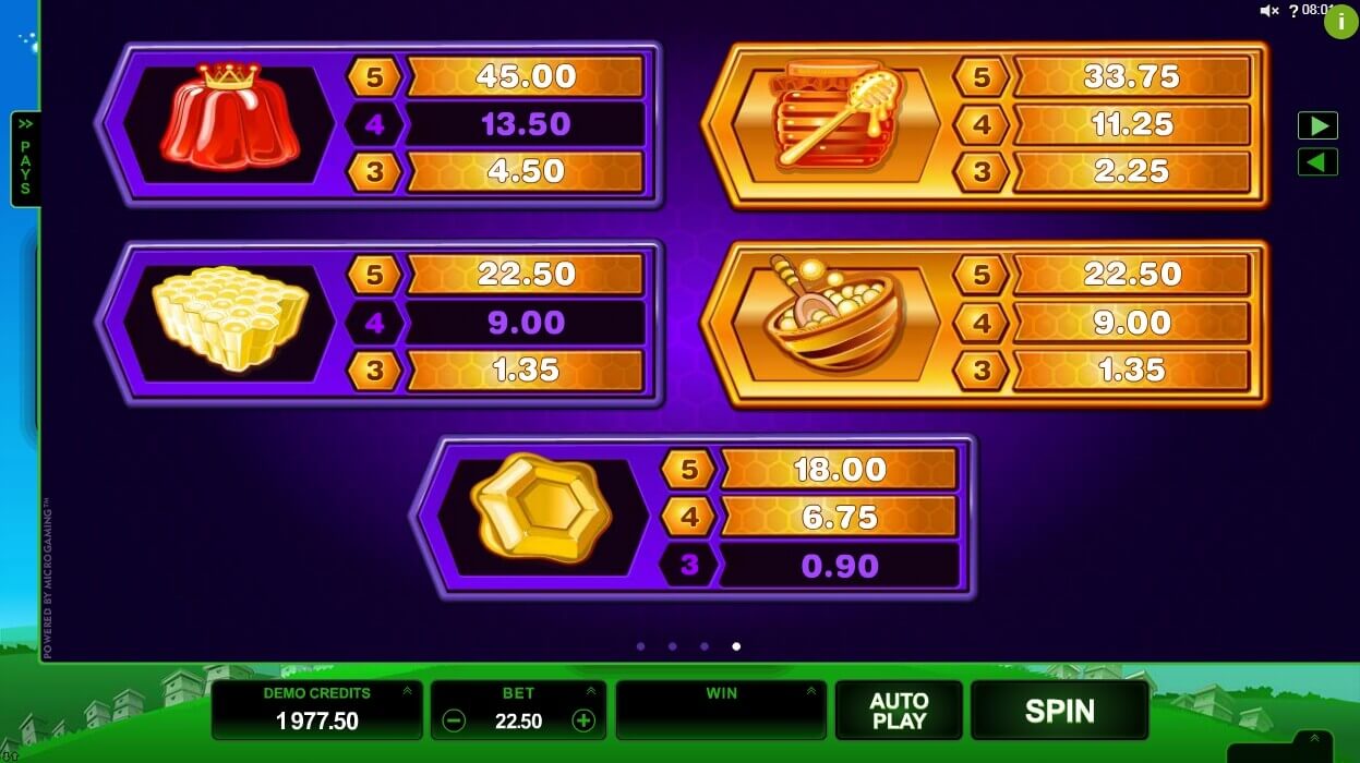 The design of the game screen of the Pollen Party casino slot is made in vibrant and acid colors, with the calming background of the apiary. The game reels are made in a form of the honeycombs. Fabulous design is completed with well-chosen music and sound effects, which will help you to plunge into the tale even more. As for the interface itself, it is very simple and convenient, and the game control buttons are familiar to every player:+/- Bet: Set the coins size.
