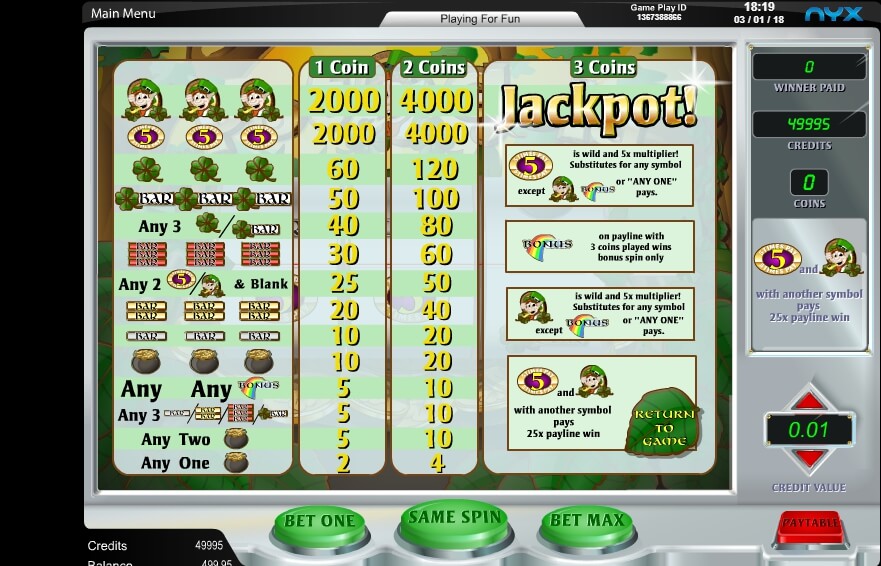 Pot O’ Gold online video game has more interesting details than you can imagine, particularly bonuses and special items. There are a couple of wild symbols. For example, leprechaun. If the player wants to win big prizes, he needs to play at the maximum betting. So, if a gamer put three coins on a bet for one pay-line, then he will get an extra multiplier to his winnings.