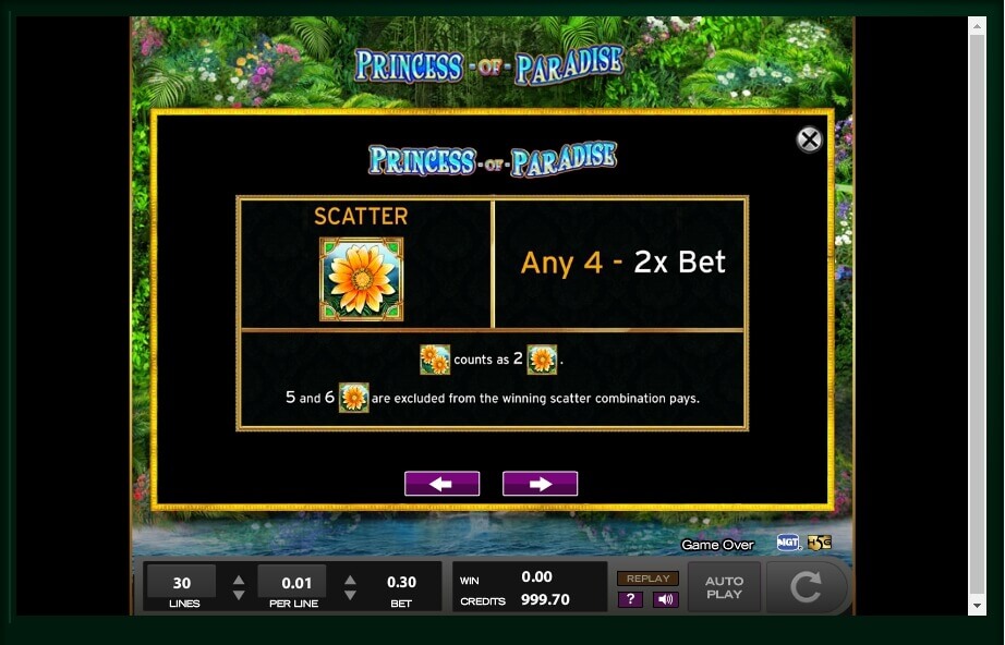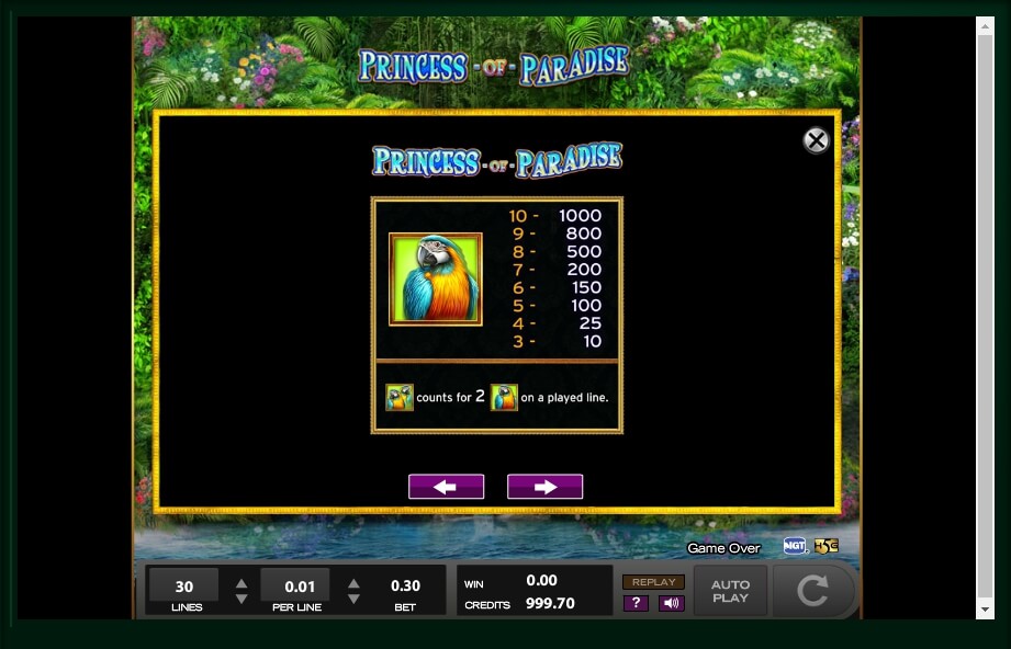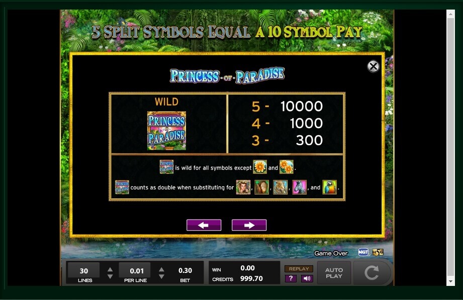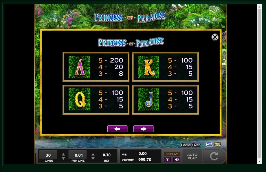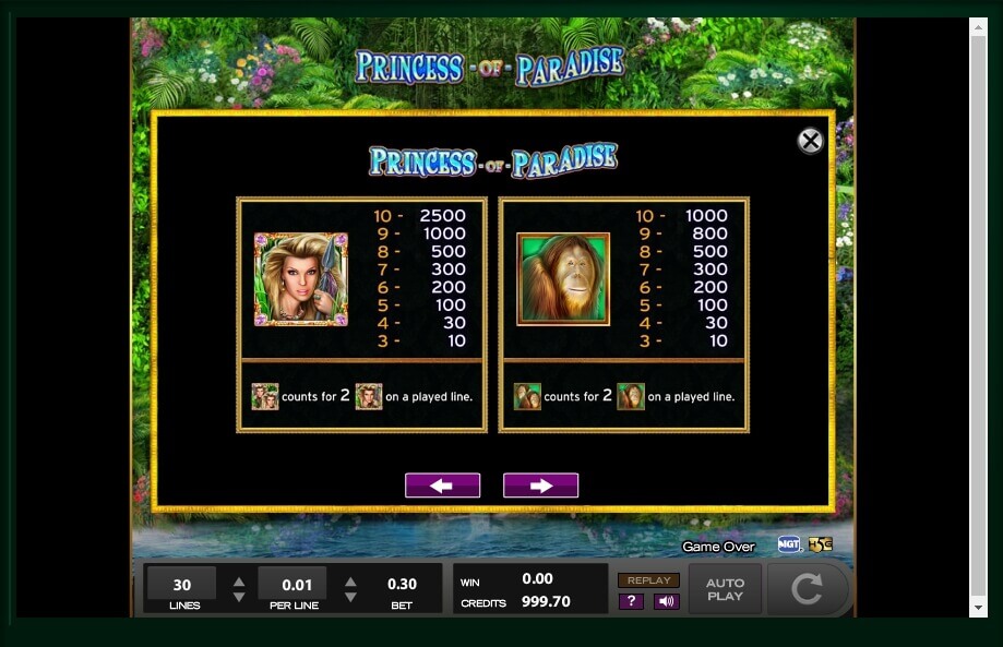 The graphic design of this gaming machine fully corresponds to the chosen theme. On the background we can see bright vegetation of the wild jungle. Of course, somewhere there are hidden treasures that accompany the beautiful princess. By the way, you’ll also meet them on 5 reels and 30 paylines.