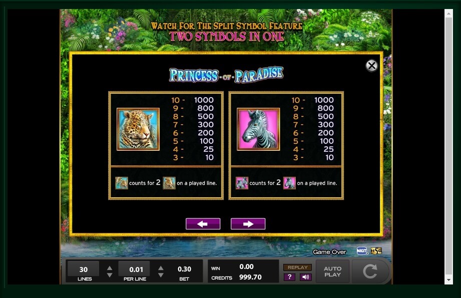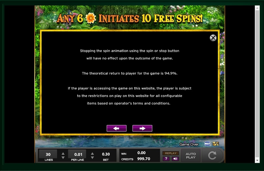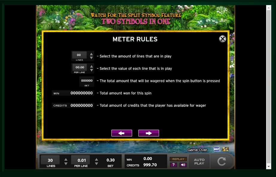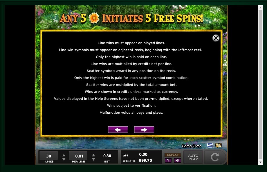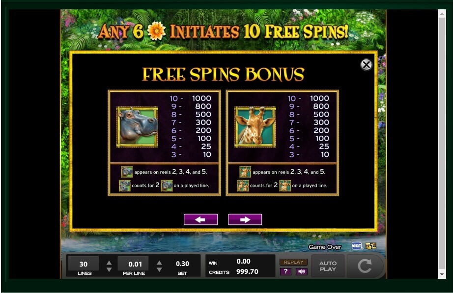 To start exploring the exotic jungle on the gaming machine, the user can after studying the theoretical section. It opens with the “help” button and contains information about the payout table, rules and structure of active lines. After that, the participant should determine the number of pay lines (Lines button) and the amount of a suitable bet (Per Line). The BET window will help you control the total amount of bets. As soon as the parameters are set, the player can start the drawing (Spin). In addition, in this video slot you can use the Auto key (having previously adjusted the number of continuous rotations).