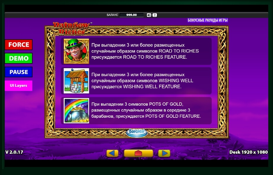 Rainbow Riches gambling experience is unique. Great Irish music, excellent graphic design and easy unobtrusive gameplay will allow you to forget about all your troubles and enjoy the gaming moments.