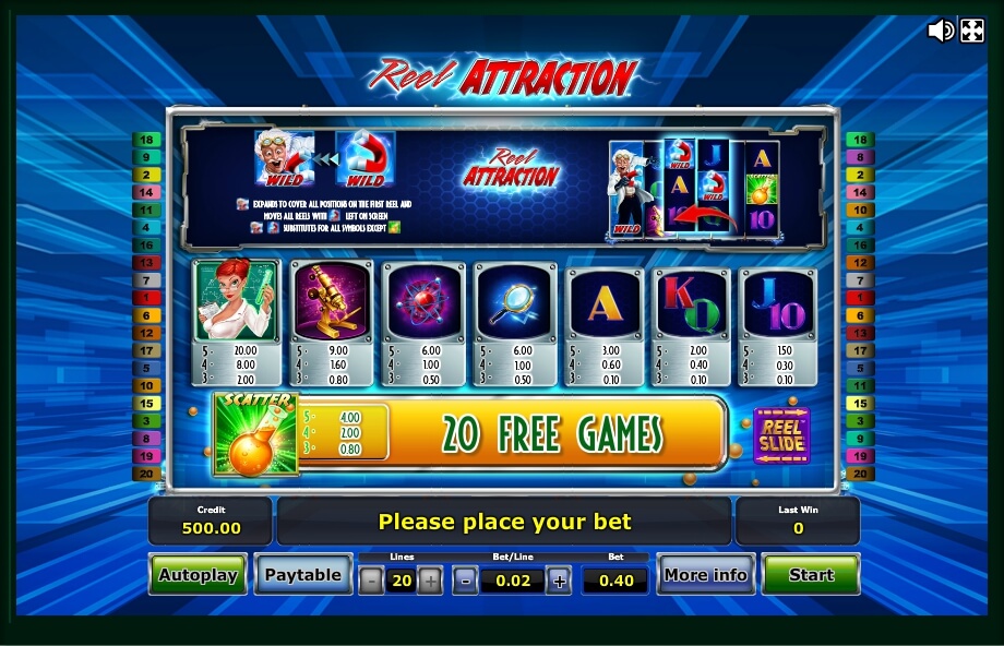 If you are thinking about the best formula for the successful gambling strategy in the Reel Attraction game, consider your variables first. You can make a minimum bet of 2 credits and a maximum of 500, which results in a maximum 10,000 bet for all the 20 paylines and per each spin.
