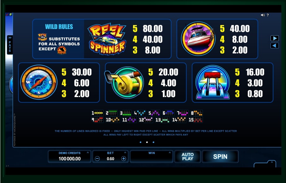 Reel Spinner Slot has another start-button then most usual slots and it is a ”Spin”. The symbols are the ”portraits” of the fishes: a lilac-blue flying fish; an orange sad looking barracuda; a greenish-blue sturgeon; an angry, pike-like, long narrow fish and with a bright-green body a parrot-fish which fins and a tail are colored in the shade of a sea wave.