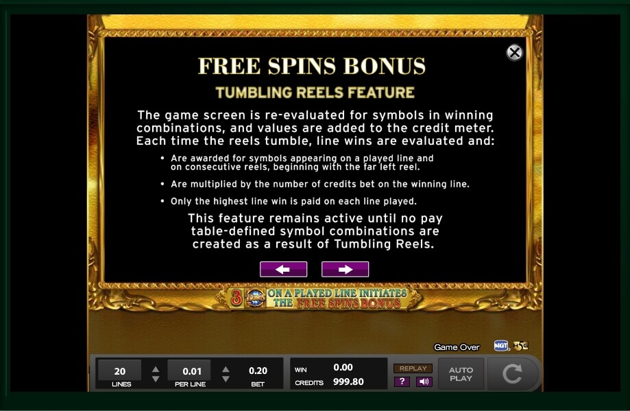 But, let’s go back to the video slot. It offers customers a convenient control panel without any complex functions. The buttons “lines” and “bet” have additional buttons that adjust the indicators. The slot offers a wide range of rates: 0.01 – 1 credit. To familiarize yourself with the slot-game’s nuances, open the “help” tab. In this section, the developers added a payout table, rules and a description of the online-game’s functions. A large golden key activates the rotation.