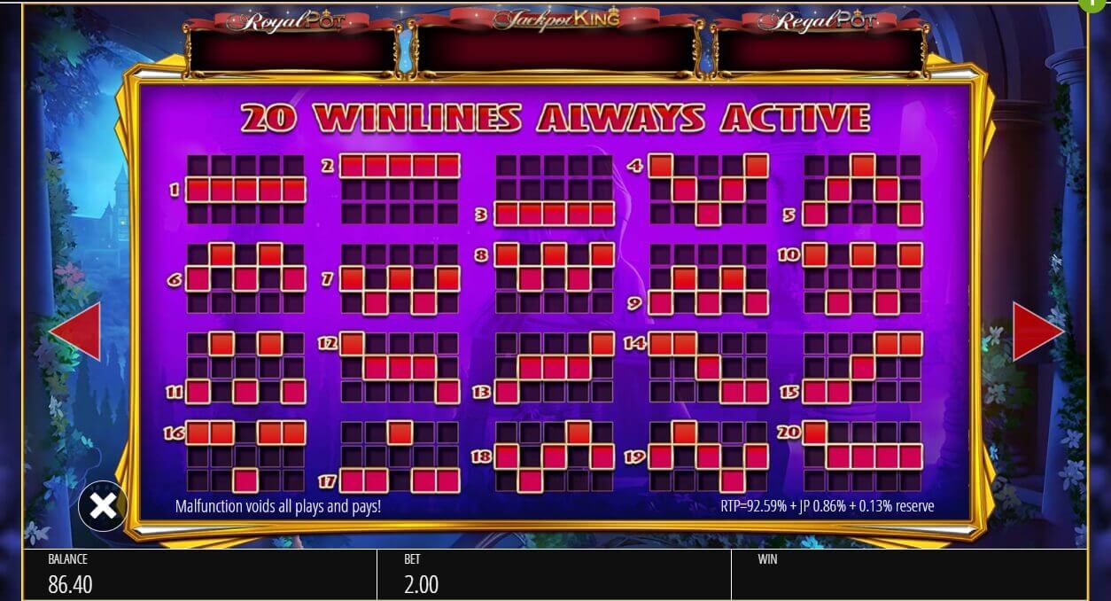 The minimal bet in the game is one coin per one line only. In total, the minimal bet per one full spin of reels will be twenty pounds. The maximal payment for the full spin of reels can reach up 500 pounds in this slot game!