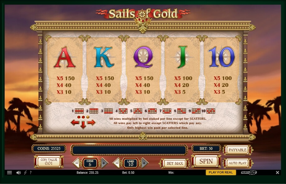 The structure of Sails of Gold provides for 5 reels with 10 active paylines. Management in the game is done using special buttons available on the control panel. The number of buttons is completely insignificant, so it is not difficult to identify their functionality, as the set of buttons is standard and they are all signed.