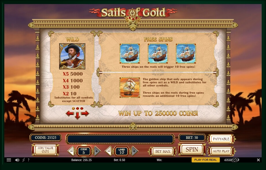 Slots of Sails of Gold will be appreciated by true connoisseurs of excitement and risk, as the offered game provides an excellent opportunity not only to relax and have a great time.