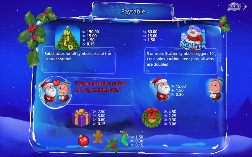 If user lands Santa and Mrs Claus on the reels next to each other, the two of them will kiss and trigger the Santa’s Kiss feature which will award him with a special win!