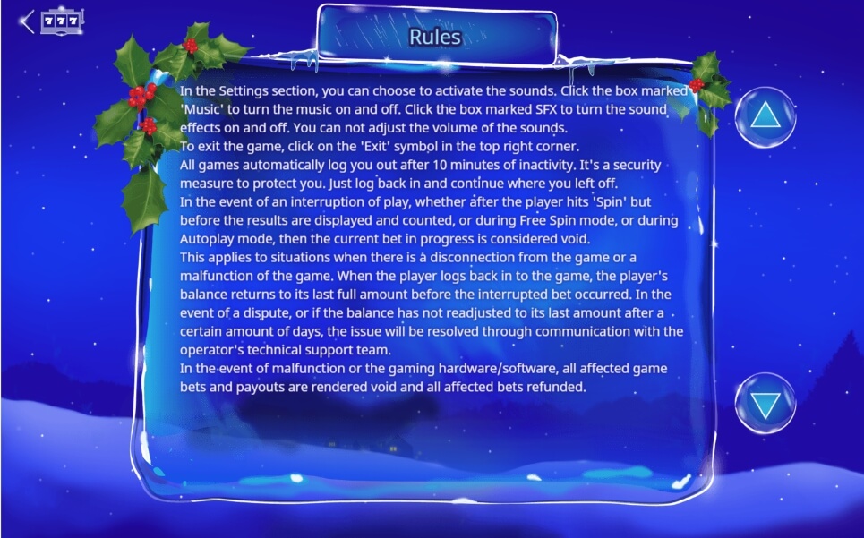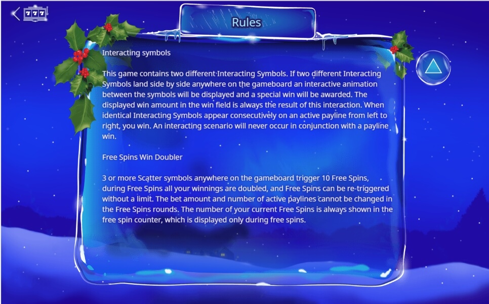 The snowman is the Scatter picture and if you find 3 or even more of them somewhere on the reels, you will activate Free Spins feature. Once activated, you will be awarded with 10 spins, and all wins will be doubled. Also, the Scatter can form scatter wins.