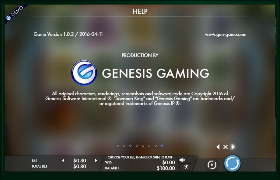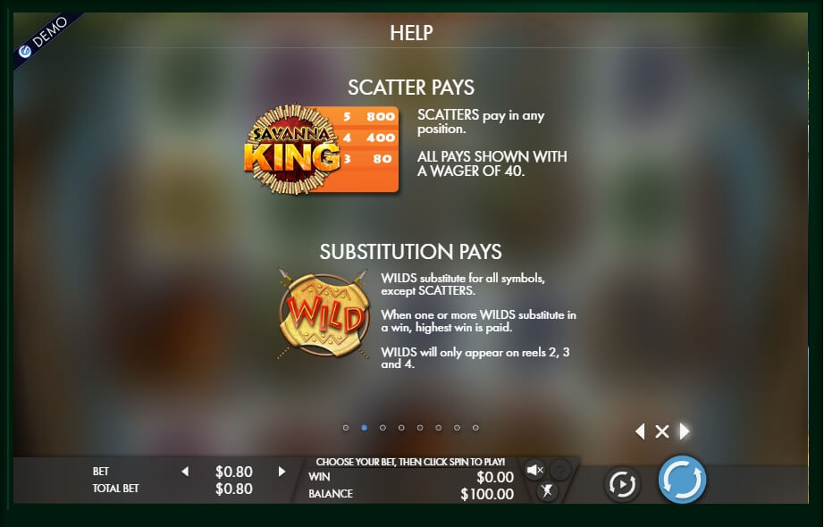The Savanna King gaming slot is equipped with 5 reels, which can form 1024 possible winning combos, for each of which you can put only one game coin with a denomination from 40 to 80 cents. For high-rollers, there is good news in the form of a jackpot equal to 800 credits with the 96.2% recoil rate.