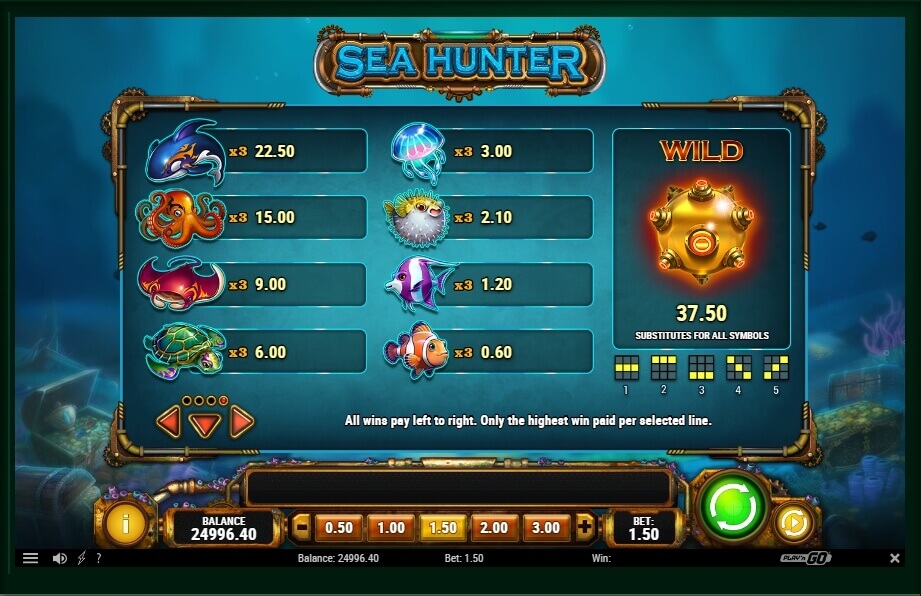 The playing field is represented by 3 coils and 5 active lines. On the edges of the playing field are mounted mobile underwater guns that release charges during large wins. An exquisite stylish design and incredibly expressive soundtracks with beautiful music, as well as piercing sirens make the game realistic.