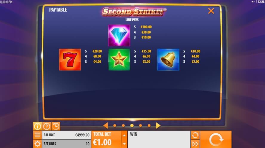 In the Second Strike online game, simple and extremely clear navigation is located at the bottom of the game window. The letter “i” in the circle opens an information block with rules, line schemes and symbol coefficients. Below, you can find a button that opens additional settings. By the way, the interface also offers windows with the current balance and game lines.