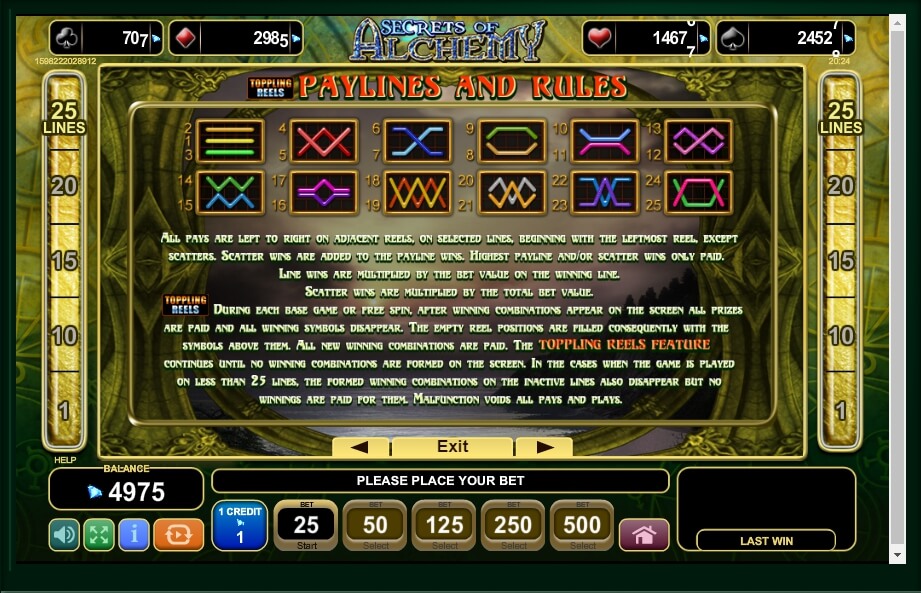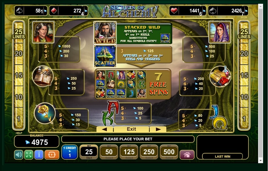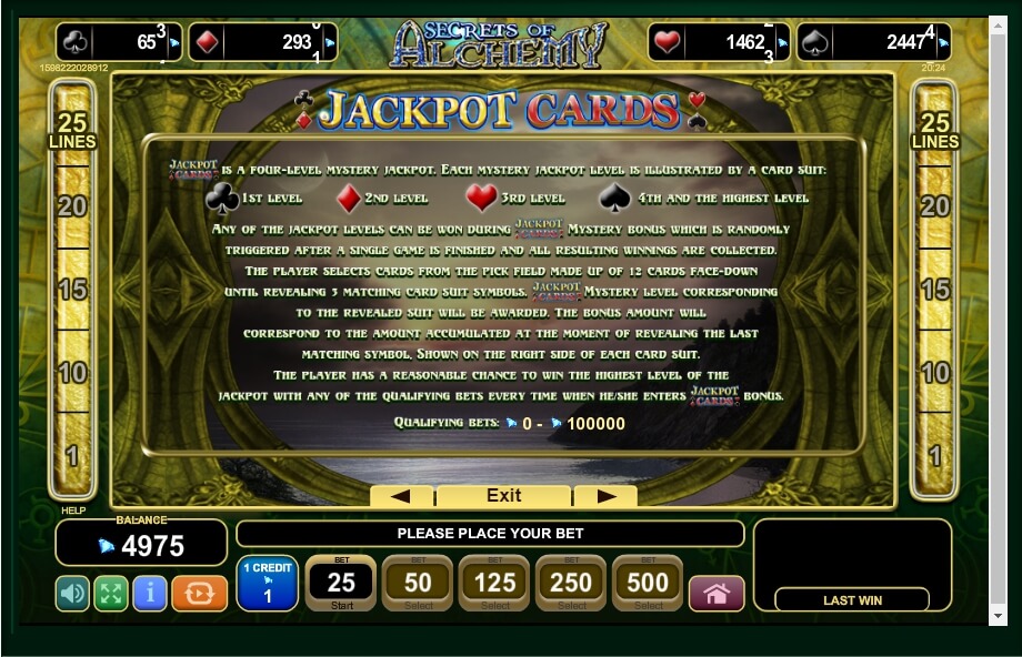 As in all the slots from EGT, Secrets of Alchemy has an opportunity to win variants of a four-level jackpot. Access to the option is active by a random principle at any point in the game after the winning spin. In the game on the jackpot you need to open the cards. In order to get a jackpot of 20 thousands, you need to open 3 cards of the same suit.