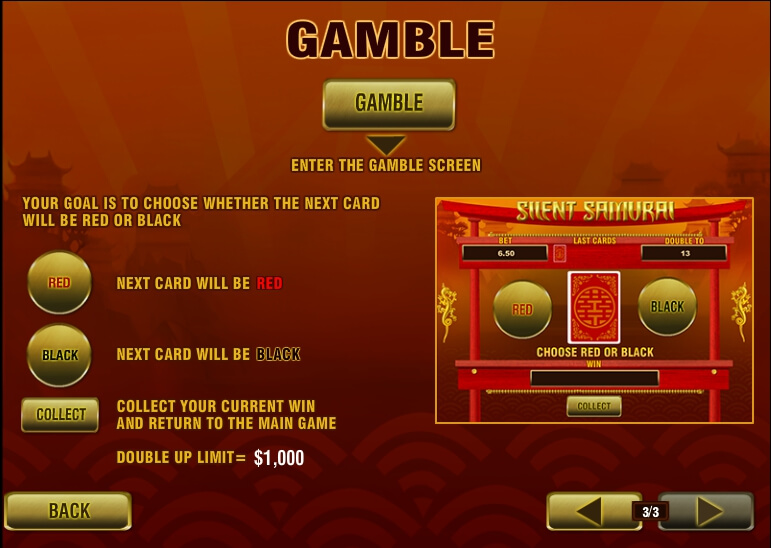 As a result of each rotation, a combination can be formed. After that, you can take part in the risk-round by using the “gamble” key. Here, the player needs to guess the color of the closed card. If he manages to do this, his last win will be doubled.