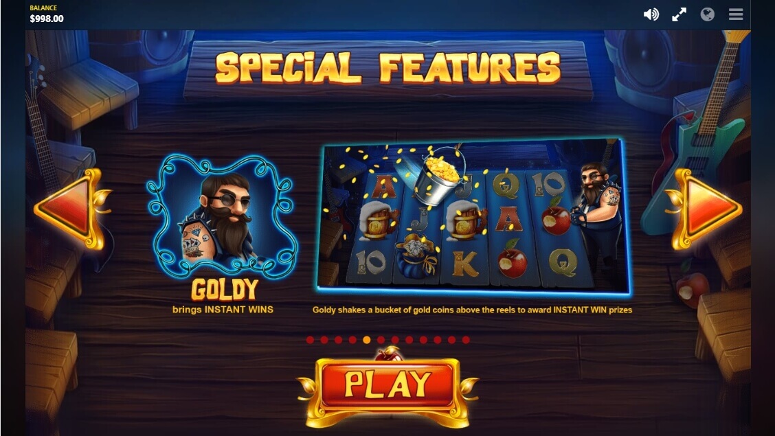 When the wheel points at Snow wild, she kisses three random companions, and their bonuses are activated by turn. Boozy pours beer froth wilds all over the table (this is the only way to obtain the symbol); Goldy awards the player with a huge instant win; Dozy moves the symbols on the reels, so they form winning combinations; Sneaky fixes a few symbols and replaces others with a winning ones; Tickly awards bonus rounds; Flash replaces symbols with other ones that can form a winning combination; and Crazy does almost the same as Flash. Each character has his own style and animations.