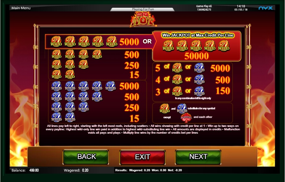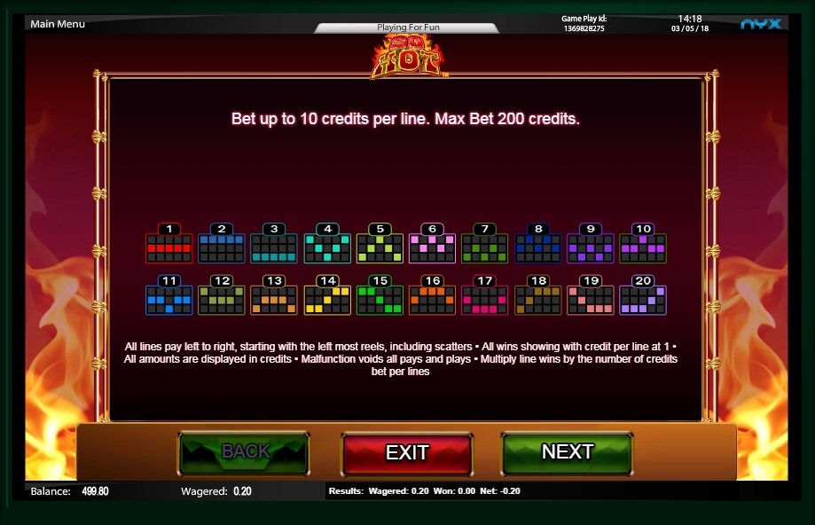 The game screen of So Hot video slot immediately drives attention. It is made in vibrant tones that don’t exhaust your eyes and you can pay you all attention to the game process. The So Hot casino game has 5 reels and 20 active lines. The wager in the game is fixed: on one line you can bet only 1 coin, and the range of denominations of rates is very extensive: from 1 to 100 cents. The jackpot in the game is 5000 coins and gets a high payout rate of the slot – 94.02%.The control panel is located at the bottom of the screen and is very convenient and familiar to every player:Credit Value: Set the coin denominations.