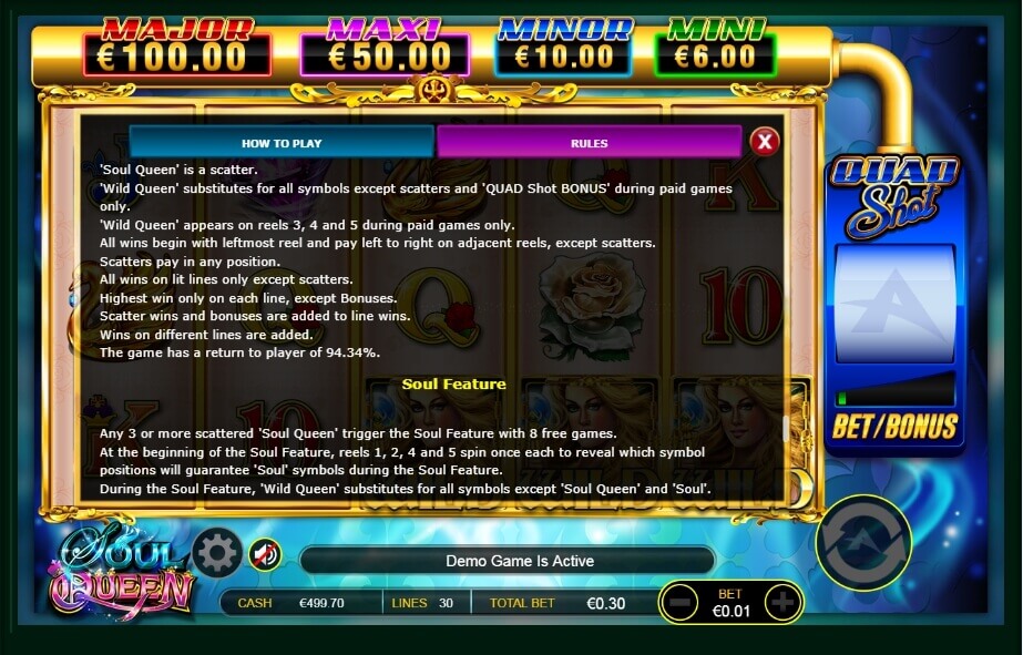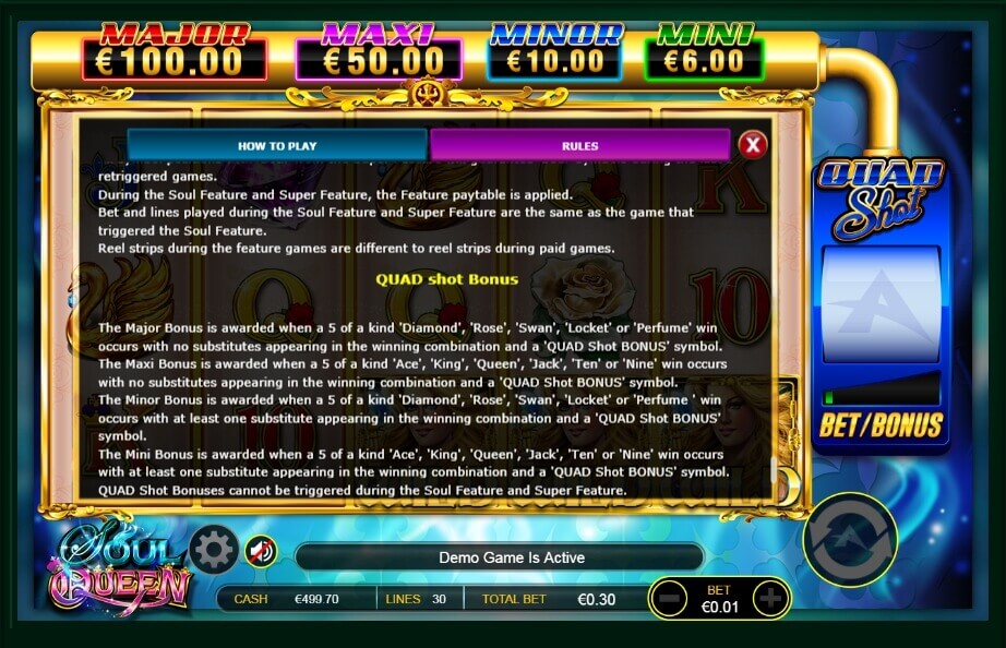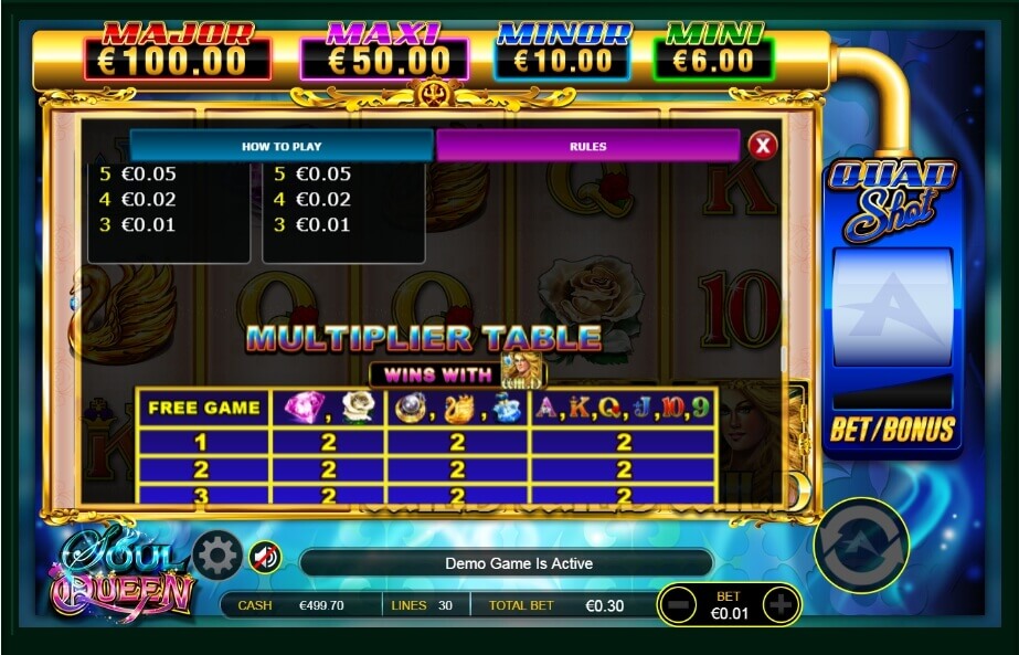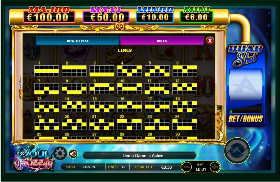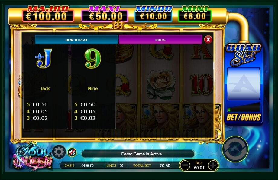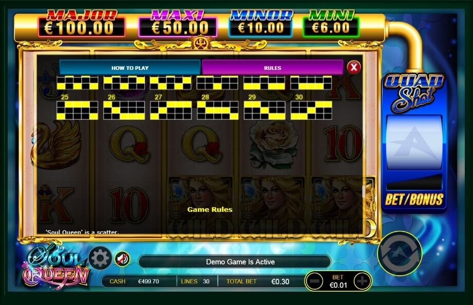 The slot has 5 (or 3) drums and 30 paylines. To manage Soul Queen Quad Shot is very simple, as such subjects bring only pleasant emotions. Therefore, before starting the reels, you should only choose the size of your bet. A minimum bet is 0.30, so you will be where to accelerate.