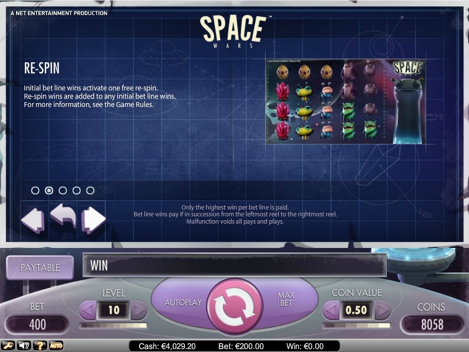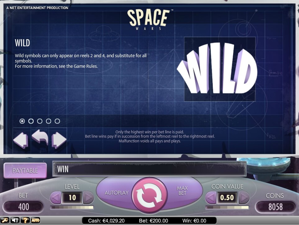 In addition, in the Space Wars casino game there is a Circular Spin function, i.e. repeated rotations with the selected bet parameters after every winning line. In general, the Space Wars video slot is a quite typical NetEnt project: it has standard 5 game drums and 40 active pay lines, with the ability to put on each of them from 1 to 10 coins. The range of bets varies from 1 to 50 cents. Also, the gambling machine has the highest lucky coefficient as for NetEnt slots – 96.8 percent!