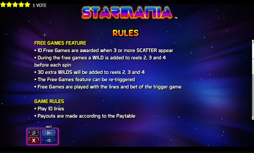 Starmania gameplay optimized with 5 reel, 3 raws and 10 fixed paylines. It’s an analytical video game; slot has similar options with video poker, blackjack, roulette, but with another screenplay. Gamer is able to start the gambling session without email verification, with no registration in the Starmania online casino game.