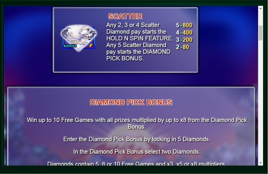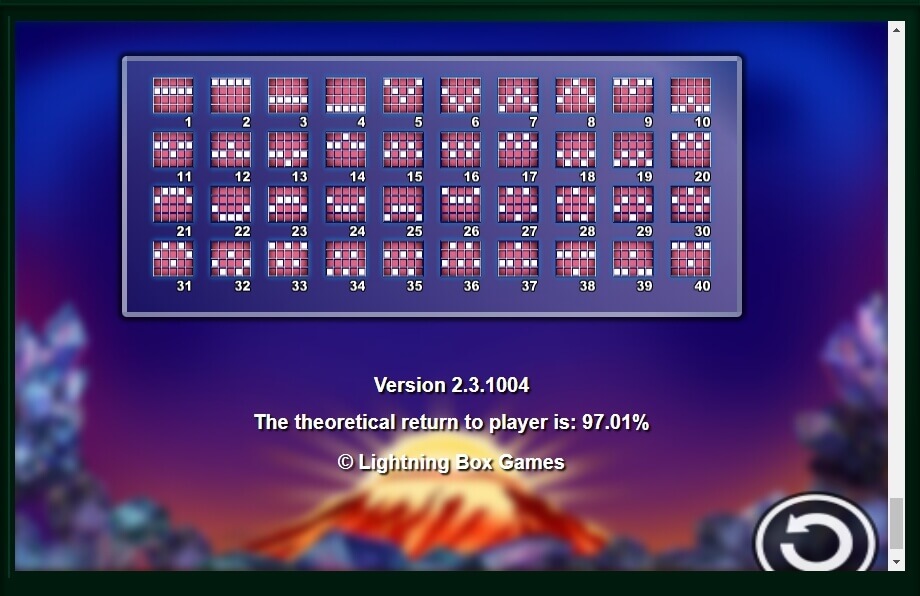 Slot consists of 40 pay lines and 5 (x4) reels. In this slot, in order to get into section with the paytable, you need to press a paytable button. This tab contains information about combinations, symbols and payments. In the game a user can determine the amount of bet and optimal number of game rows.